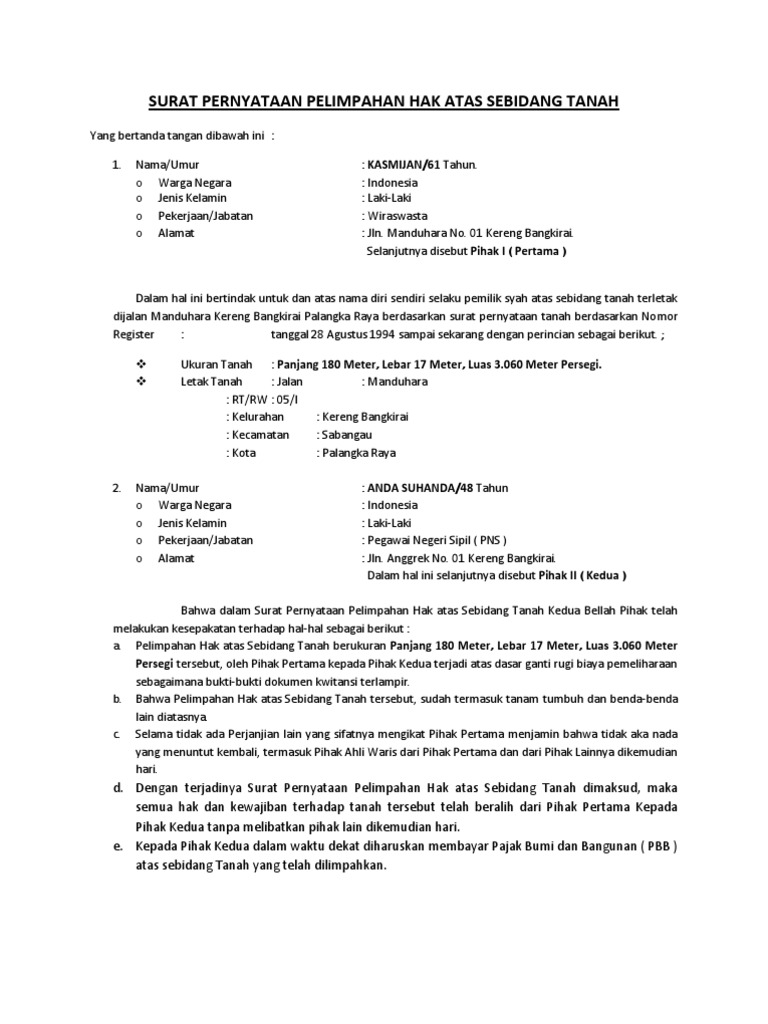 Contoh Akta Pelepasan Hak Atas Tanah Pdf - Asia from blogpictures.99.co Contoh surat dinas resmi full block style; Contoh surat keterangan hibah tanah merupakan surat yang menerangkan pemberian atau hibah sebidang tanah kepada orang lain. Maupun saham kepada anak kandungnya dan adanya wp yang mengajukan permohonan surat keterangan bebas pajak penghasilan atas pengalihan hak atas tanah dan atau bangunan yang terkait dengan hibah rumah tersebut. Salah satu bentuk harta yang sering dihibahkan oleh seseorang adalah harta berupa tanah. Contoh surat hibah tanah dari orang tua kepada anak, contoh surat hibah tanah dari orang tua kepada anak pdf, contoh surat hibah tanah dari orang tua kepada anak word, contoh surat hibah tanah dari orang tua kepada anaknya, pernyataan hibah contoh surat hibah tanah dari orang tua kepada anak, surat hibah contoh surat penyerahan tanah dari orang tua kepada anak Namun jika hibah tersebut tidak disertai dengan surat keterangan hibah, maka bukan tidak mungkin akan terjadi permasalahan di kemudian hari, dikarenakan beberapa hal. Contoh surat hibah tanah dari orang tua kepada anak seseorang pemilik tanah memiliki hak untuk menghibahkan tanahnya kepada siapa saja, termasuk kepada anaknya. Dengan demikian, anak yang lain tidak akan bisa mengklaim kepemilikan tanah tersebut.